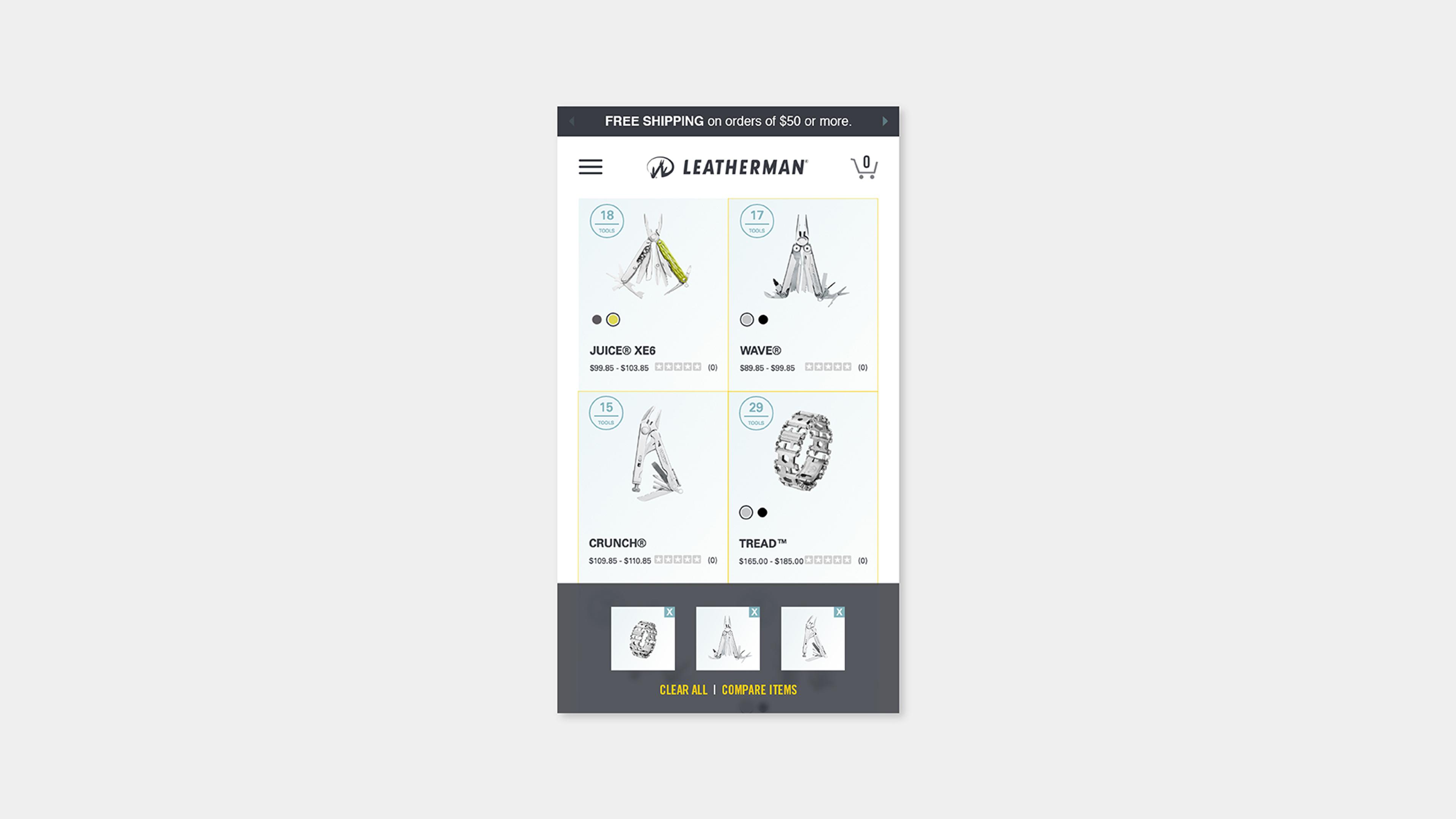 Leatherman has developed a large catalog of products inspired by their original multitool. Each product houses a variety of tools, mostly nested in the grips of a large pair of pliers. Different iterations of the product were designed around various use cases, such as tools for camping, emergency response, or household tasks. However, since the base form-factor tended to be fairly consistent, it was sometimes difficult for customers to easily identify the differences between products. To solve that problem on the Leatherman website, the first step was for users to select a collection of tools to compare.